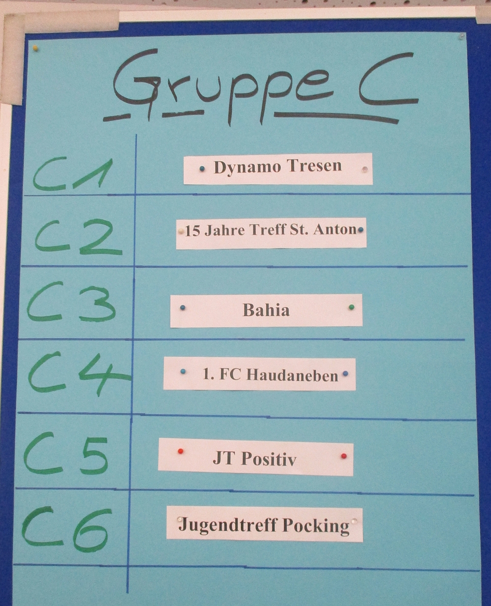 - Gruppe C: Dynamo Tresen, 15 Jahre Treff St. Anton, Haus Pax, 1. FC Haudaneben, JT Positiv, JT Pocking