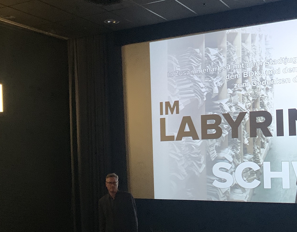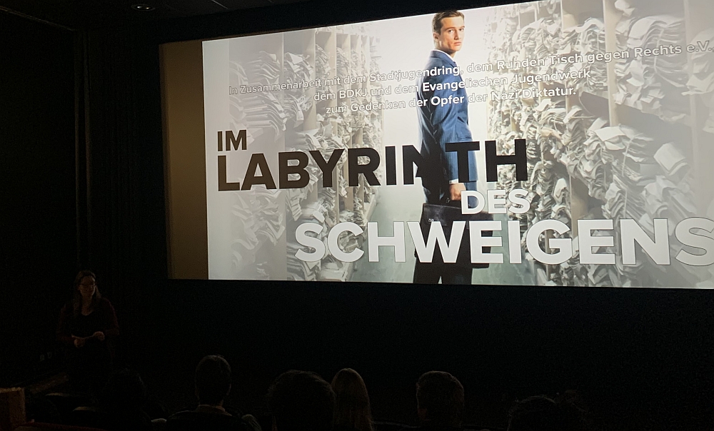 Abends wurde im Cineplex in Kooperation mit dem Runden Tisch gegen Rechts, dem BDKJ und der Evangelischen Jugend der Film „Im Labyrinth des Schweigens“ gezeigt. Ein Film, der in den 1950er spielt und sich mit den Auschwitzprozessen beschäftigt. Auf eindrucksvolle Weise vermittelte er, wie wichtig eine Aufarbeitung und Erinnerung an die Zeit war und immer noch ist und dass Menschen, die solche grausamen Taten begangen haben unbedingt zur Verantwortung gezogen werden müssen, um den Überlebenden wieder ein Stück Gerechtigkeit zukommen zu lassen.