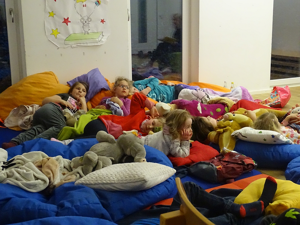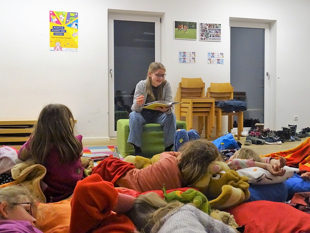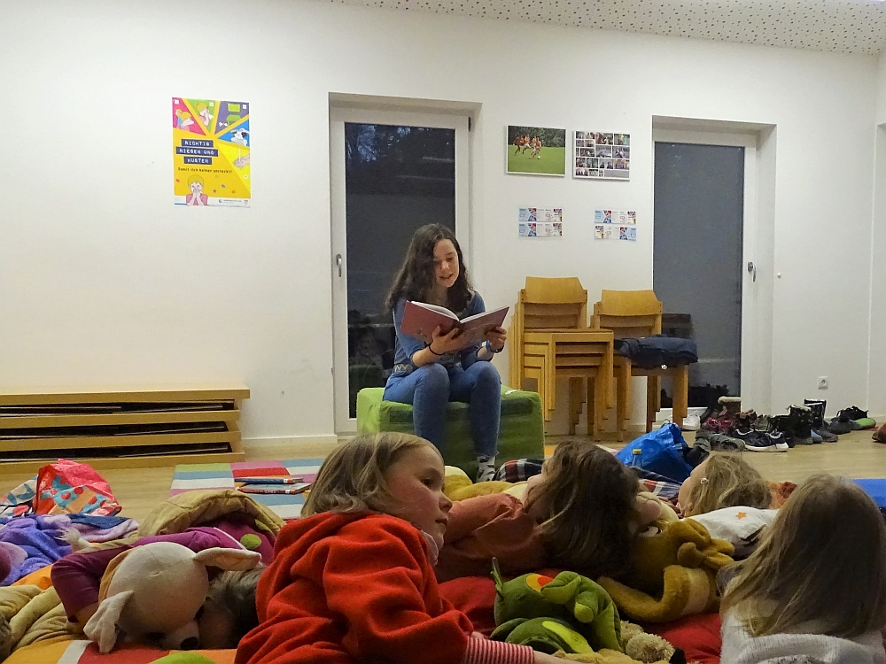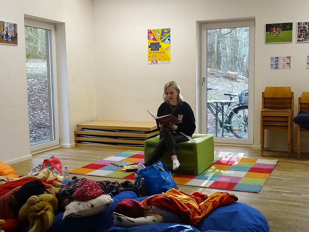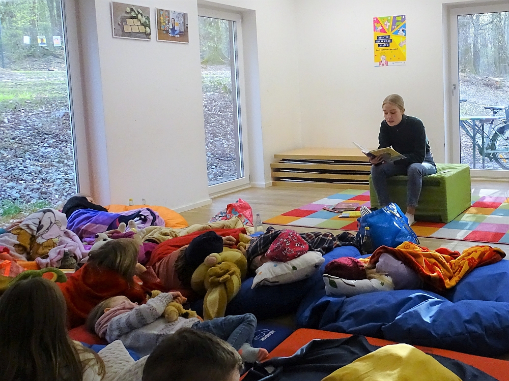 Am Samstag, den 9. April 2022 fand die Vorlesenacht des Stadtjugendrings Passau im Walderlebnispark statt. Ab 18 Uhr versammelten sich 16 Kinder im Gruppenraum und machten es sich mit Kissen und Kuscheltieren gemütlich.