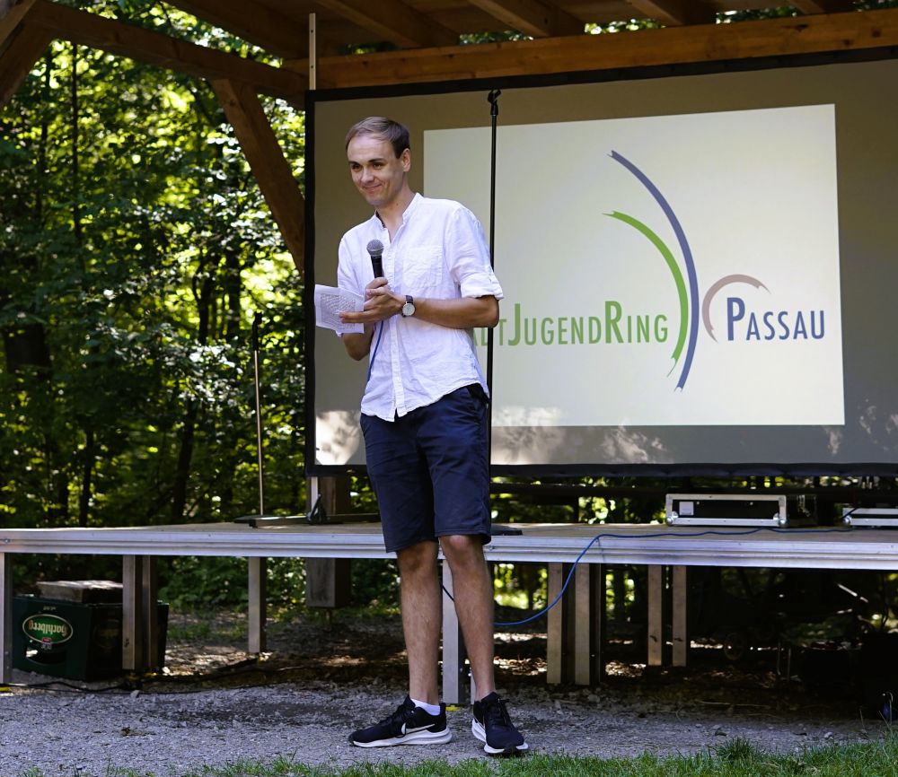 Eröffnet wurde das Fest mit einer Rede des SJR-Vorsitzenden Tobias Waldherr. Er dankte dabei vor allem den ehrenamtlichen Teamern, ohne die seit Jahren das Ferienprogramm und das Spielmobil nicht möglich wären und die auch am Tag des Sommerfests fleißig beim Kuchen- und Getränkeverkauf, beim Basteln oder Glitzertattoos machen mithalfen. Zudem wies er auf das neugestaltete Spielmobil hin, das in Zusammenarbeit mit der Stadt Passau und mit einem Malwettbewerb an den Passauer Grundschulen von dem Künstler Fabian Edenharder neu besprüht wurde.